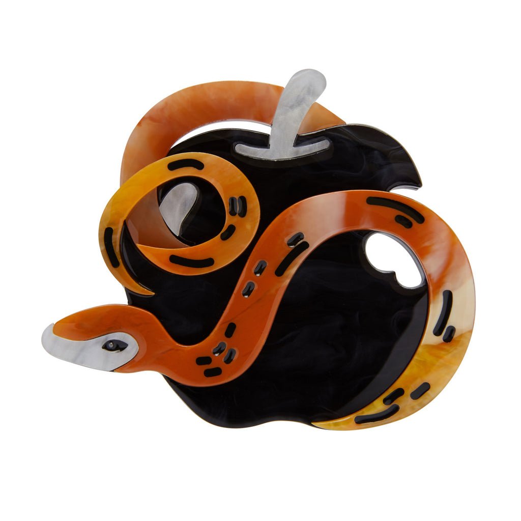 There's no need to be afraid of this danger noodle, he just loves apples. With a combination of beautiful marbled, textured resins, Take a Bite features hand-painted and hand-assembled details. Match with our Bite Night earrings for some animalistic inspired looks, to bring a bit of fright to your fashions.