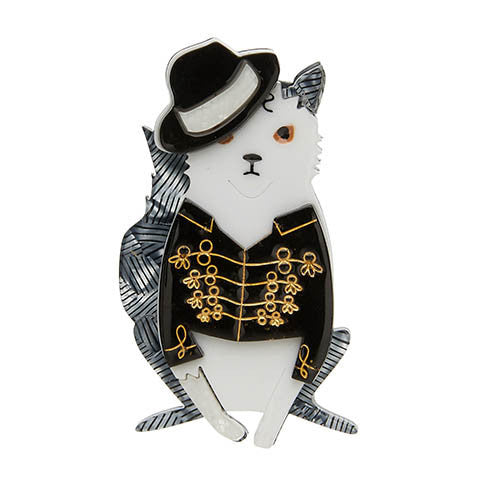 This soulful cat brooch is inspired by legendary King of Pop Michael Jackson and he wants to rock with you! Made from solid and patterned resins with hand painted details, signature jacket and tilted hat, there's no doubt it's a thriller but we warned, this rockin' kitty is one smooth criminal.